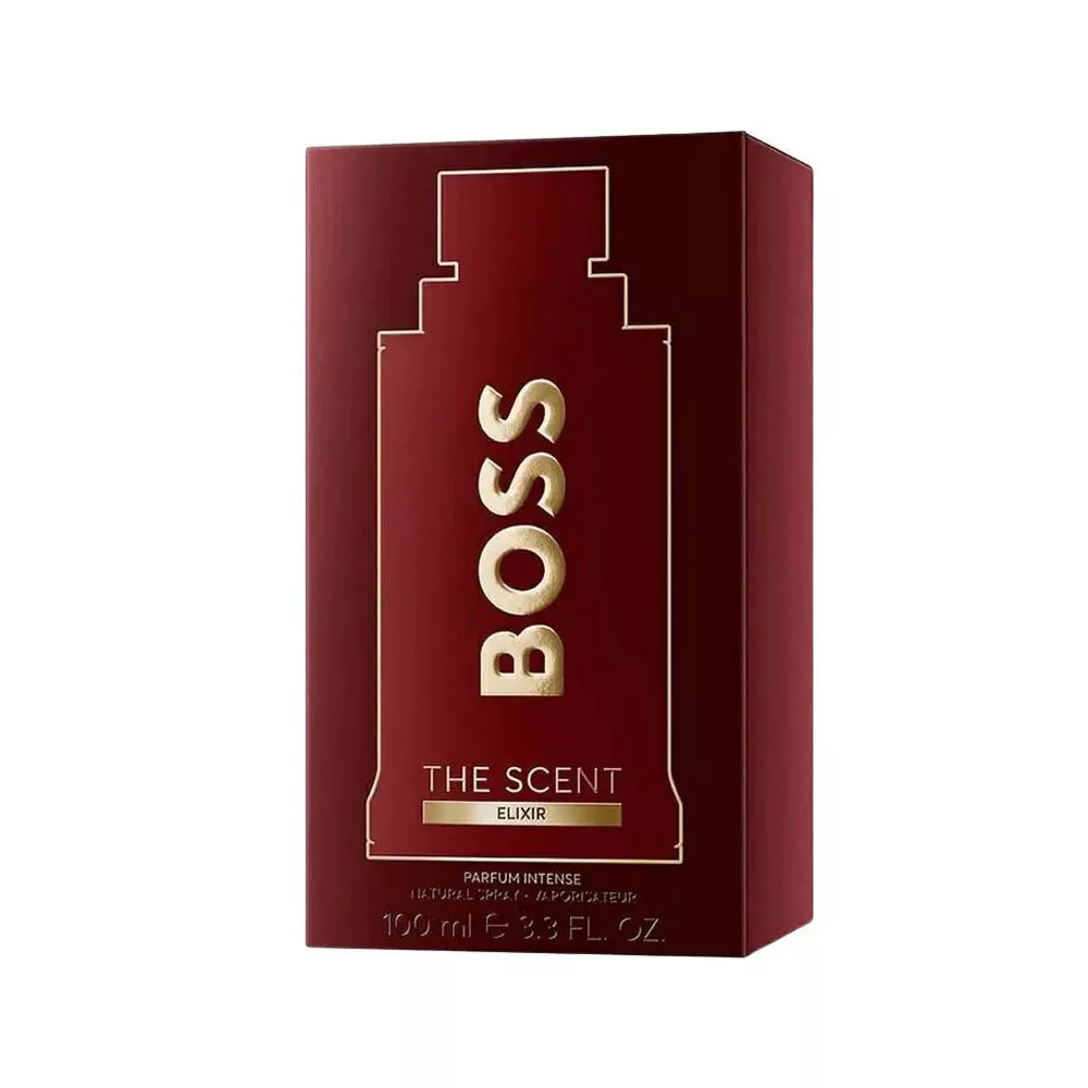 O icônico frasco do BOSS The Scent é revestido com o mesmo vidro laqueado vermelho-escuro de sua contraparte feminina, refletindo a intensidade do aroma sedutor em seu interior. O frasco é coberto por uma tampa dourada quente com um luxuoso acabamento acetinado, refletindo os detalhes metálicos brilhantes na embalagem externa.