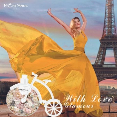 A delicadeza das pétalas de jasmim e flores de laranjeira encontra-se com a personalidade da lavanda e compõe as notas de coração da nova fragrância With Love Glamour Mont’Anne, na qual as flores claras preparam para o surgimento quase místico da baunilha, do âmbar e do cedro: este é o aroma que evoca uma aura cintilante e repleta de carisma e feminilidade para a mulher que equilibra poder e sensualidade, transformando os ambientes com a suavidade marcante de sua presença inesquecível. A luxuosa embalagem em formato de bicicleta retrô parisiense realça a personalidade do perfume, e integra a coleção de bicicletas Mont’Anne que já se consagraram entre os amantes da marca.